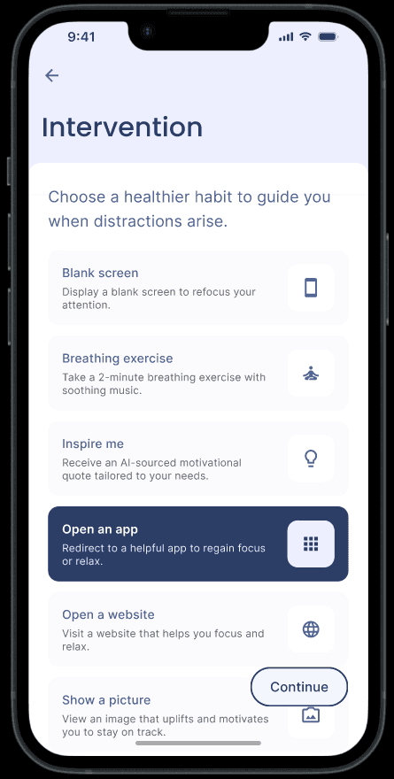Users could set up redirections to apps or activities like mindfulness exercises, motivational websites, or calming activities to manage urges in real-time.